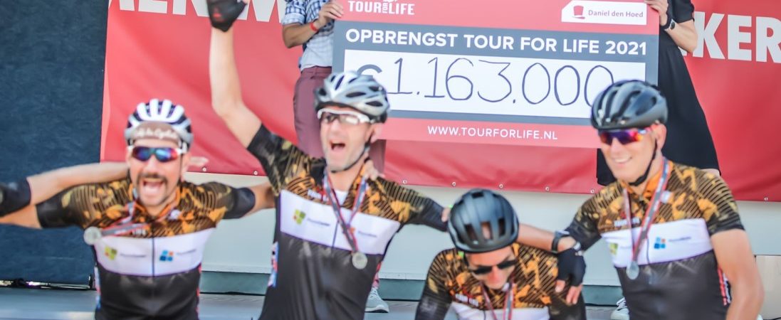 Op 5 september 2021 finishten de deelnemers van het wielerevenement Tour for Life in Valkenburg. Samen fietsten zij maar liefst € 1.163.000,- aan sponsorgeld bij elkaar en brachten zij de Erasmus MC Foundation – Daniel den Hoed Fonds onder de aandacht. Op deze manier wordt belangrijk kankeronderzoek in het Erasmus MC Kanker Instituut mogelijk gemaakt. Wil je meer informatie over dit fonds, zelf of namens jouw bedrijf ook sponsoren of in 2022 meerijden met Tour for Life? Kijk dan hier voor meer informatie.